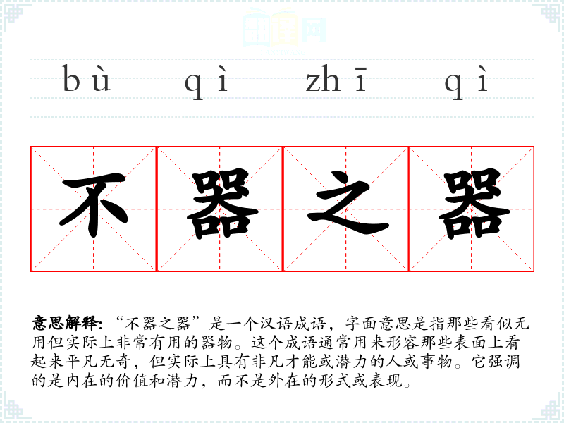 “不器之器”是一个汉语成语,字面意思是指那些看似无用但实际上非常有用的器物。这个成语通常用来形容那些表面上看起来平凡无奇,但实际上具有非凡才能或潜力的人或事物。它强调的是内在的价值和潜力,而不是外在的形式或表现。