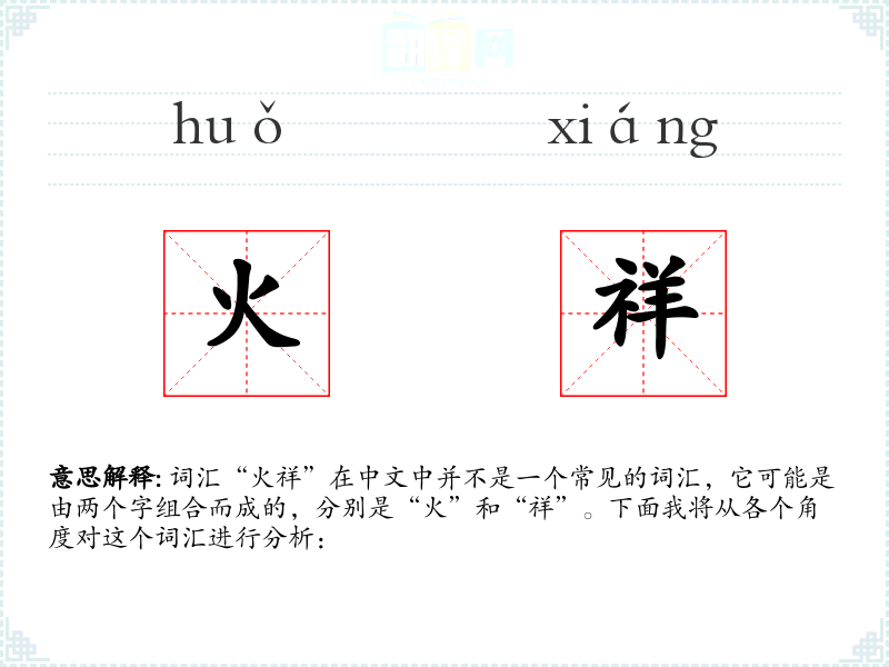 词汇“火祥”在中文中并不是一个常见的词汇,它可能是由两个字组合而成的,分别是“火”和“祥”。下面我将从各个角度对这个词汇进行分析: