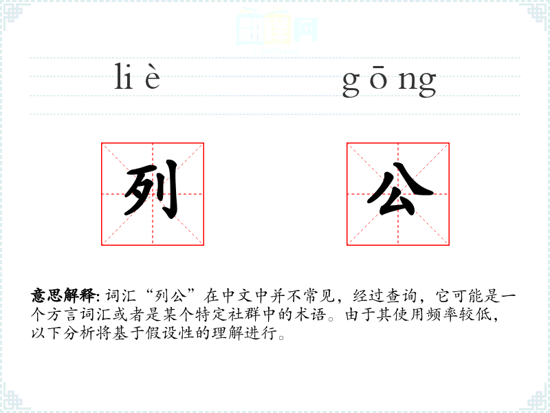 词汇“列公”在中文中并不常见,经过查询,它可能是一个方言词汇或者是某个特定社群中的术语。由于其使用频率较低,以下分析将基于假设性的理解进行。