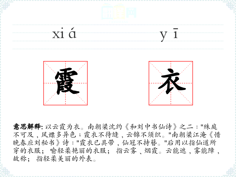 1.以云霞为衣。南朝梁沈约《和刘中书仙诗》之二﹕"殊庭不可及﹐风熛多异色﹔霞衣不待缝﹐云锦不须织。"南朝梁江淹《惜晚春应刘秘书》诗﹕"霞衣已具带﹐仙冠不持簪。"后用以指仙道所穿的衣服; 喻轻柔艳丽的衣服; 指云雾﹑烟霞。云能遮﹐雾能障﹐故称; 指轻柔美丽的外表。
