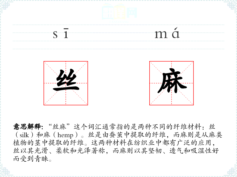 “丝”字源自古代对蚕丝的称呼,而“麻”则源自麻类植物的名称。在古代**,丝和麻都是重要的纺织原料,其生产和使用历史悠久,对文化和经济都有深远影响。