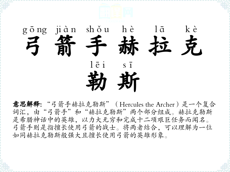 “弓箭手赫拉克勒斯”(Hercules the Archer)是一个复合词汇,由“弓箭手”和“赫拉克勒斯”两个部分组成。赫拉克勒斯是希腊神话中的英雄,以力大无穷和完成十二项艰巨任务而闻名。弓箭手则是指擅长使用弓箭的战士。将两者结合,可以理解为一位如同赫拉克勒斯般强大且擅长使用弓箭的英雄形象。