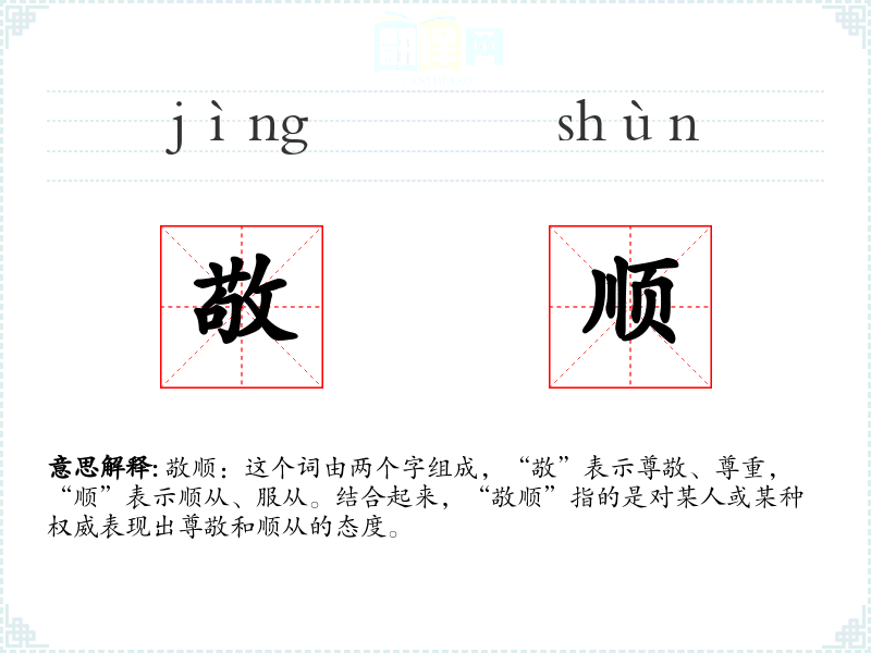 敬顺:这个词由两个字组成,“敬”表示尊敬、尊重,“顺”表示顺从、服从。结合起来,“敬顺”指的是对某人或某种权威表现出尊敬和顺从的态度。
