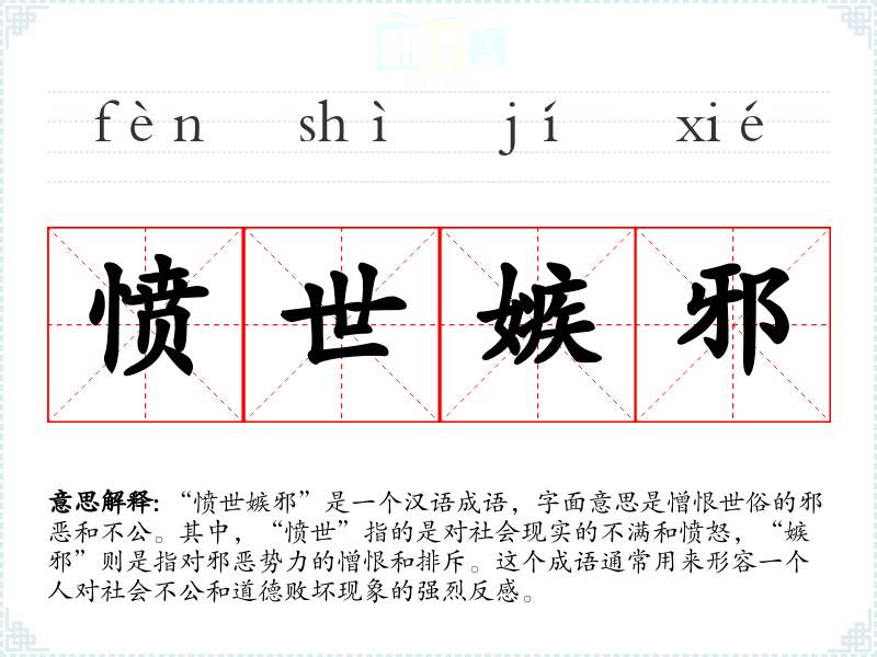 在英语中,类似的表达可能是“fighting against injustice”或“hating evil”,这些表达虽然传达了相似的情感,但缺乏“愤世嫉邪”这个成语所蕴含的深刻文化内涵和历史背景。