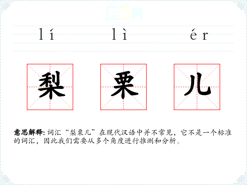 “梨栗儿”可能是由“梨”和“栗”两个词组合而成的,字面意思可能是指梨和栗子这两种水果。然而,由于这个词汇并不常见,它的确切含义可能需要更多的上下文来确定。