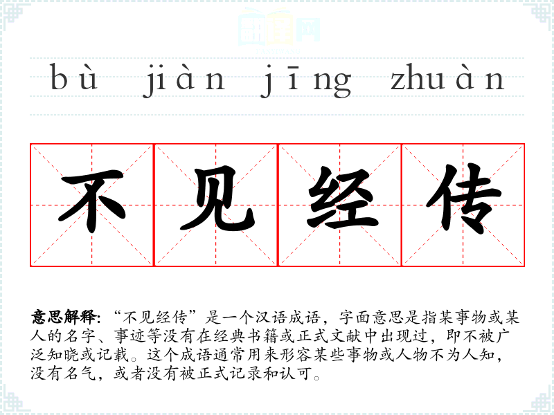 “不见经传”是一个汉语成语,字面意思是指某事物或某人的名字、事迹等没有在经典书籍或正式文献中出现过,即不被广泛知晓或记载。这个成语通常用来形容某些事物或人物不为人知,没有名气,或者没有被正式记录和认可。