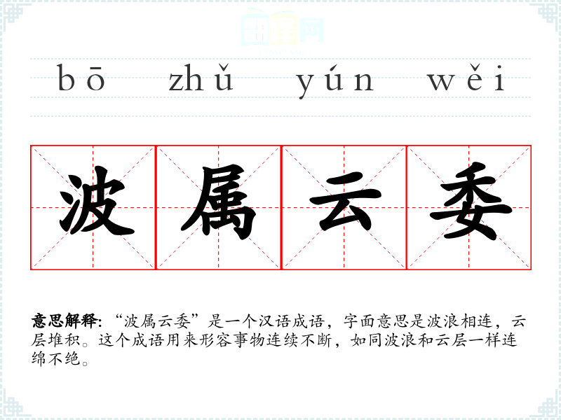 “波属云委”是一个汉语成语,字面意思是波浪相连,云层堆积。这个成语用来形容事物连续不断,如同波浪和云层一样连绵不绝。
