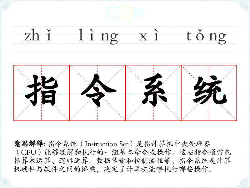 同义词:指令集架构(Instruction Set Architecture, ISA) 反义词:无直接反义词,但可以考虑“无指令”或“非指令系统”来表示没有或不使用指令系统的情况。