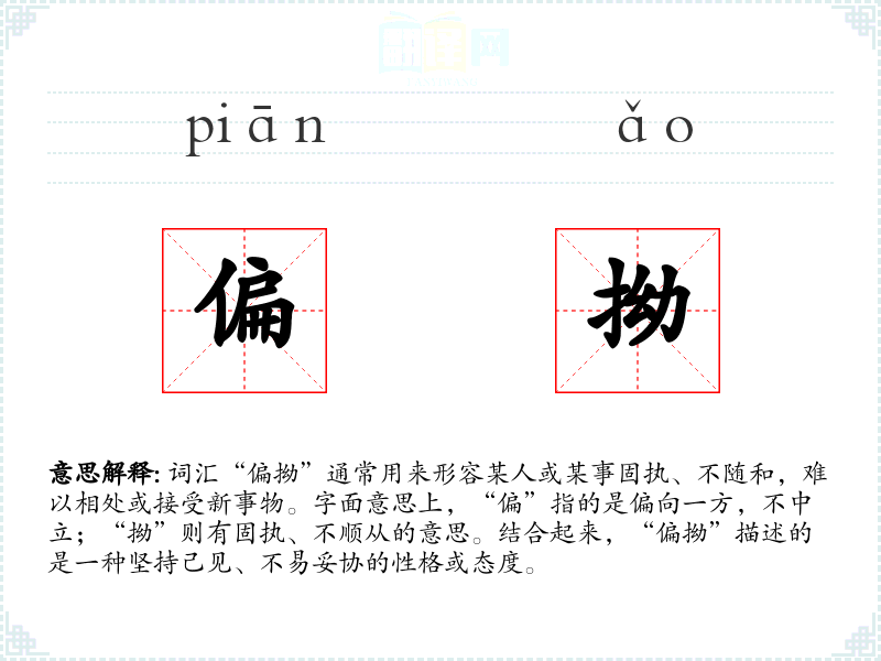 词汇“偏拗”通常用来形容某人或某事固执、不随和,难以相处或接受新事物。字面意思上,“偏”指的是偏向一方,不中立;“拗”则有固执、不顺从的意思。结合起来,“偏拗”描述的是一种坚持己见、不易妥协的性格或态度。