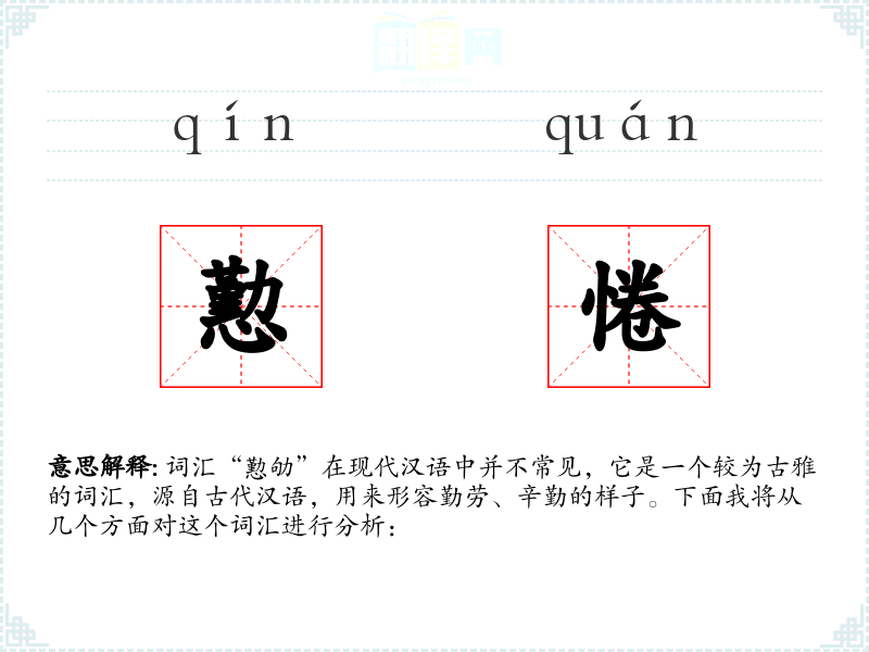 词汇“懃劬”在现代汉语中并不常见,它是一个较为古雅的词汇,源自古代汉语,用来形容勤劳、辛勤的样子。下面我将从几个方面对这个词汇进行分析: