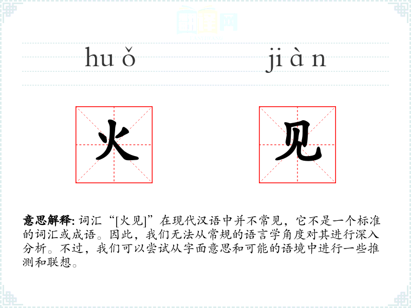 词汇“[火见]”在现代汉语中并不常见,它不是一个标准的词汇或成语。因此,我们无法从常规的语言学角度对其进行深入分析。不过,我们可以尝试从字面意思和可能的语境中进行一些推测和联想。