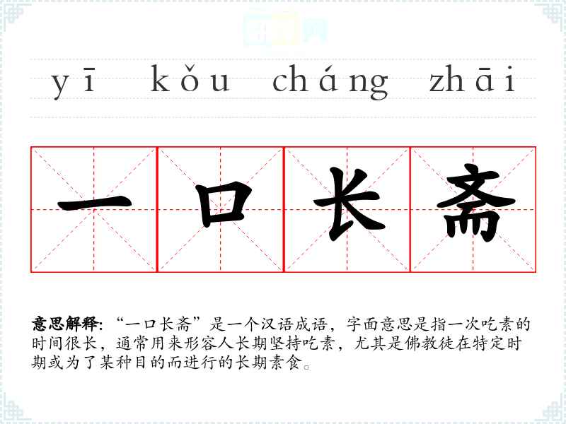 “一口长斋”是一个汉语成语,字面意思是指一次吃素的时间很长,通常用来形容人长期坚持吃素,尤其是**徒在特定时期或为了某种目的而进行的长期素食。