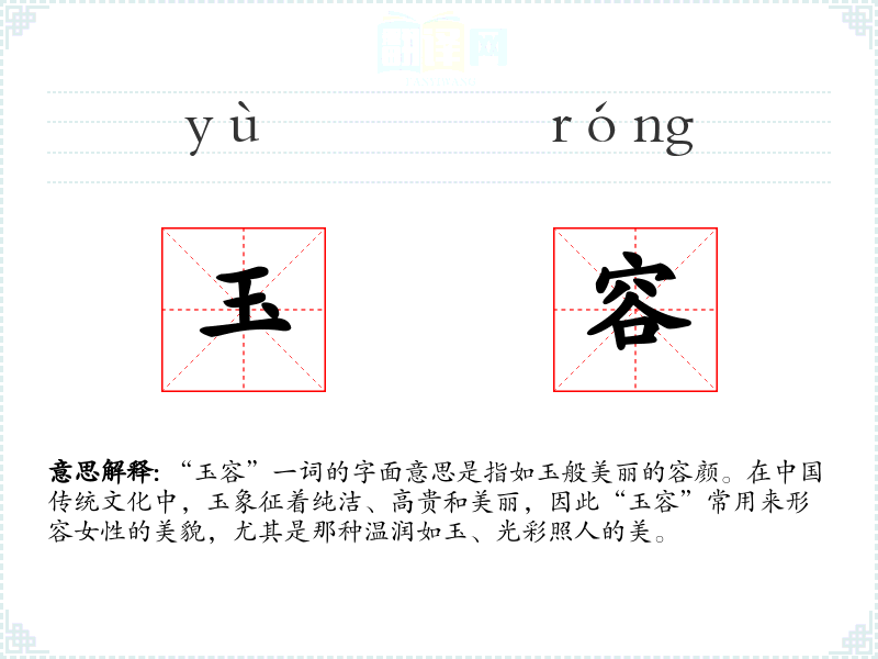 “玉容”一词源于古代对玉的崇拜和赞美,玉在文化中一直象征着美好和高贵。随着时间的推移,“玉容”逐渐成为形容女性美貌的固定词汇。