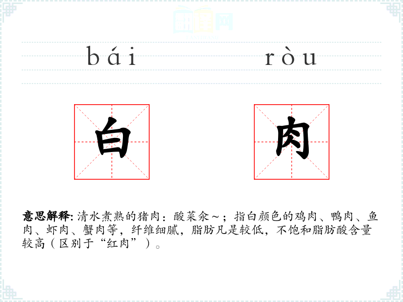 清水煮熟的猪肉:酸菜氽~;指白颜色的鸡肉、鸭肉、鱼肉、虾肉、蟹肉等,纤维细腻,脂肪凡是较低,不饱和脂肪酸含量较高(区别于“红肉”)。