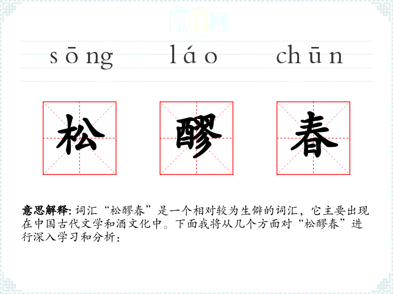 词汇“松醪春”是一个相对较为生僻的词汇,它主要出现在*古代文学和酒文化中。下面我将从几个方面对“松醪春”进行深入学和分析: