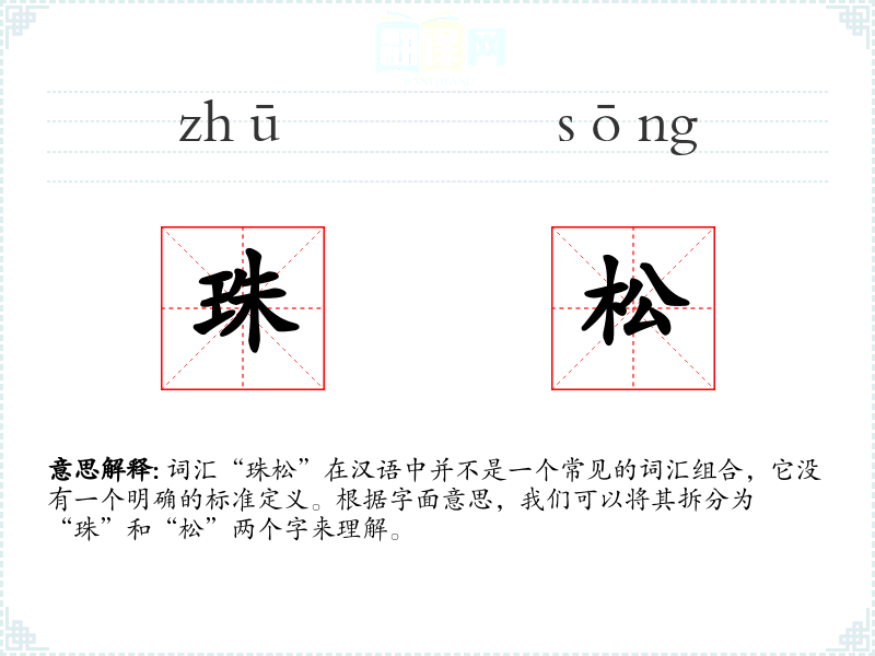 词汇“珠松”在汉语中并不是一个常见的词汇组合,它没有一个明确的标准定义。根据字面意思,我们可以将其拆分为“珠”和“松”两个字来理解。