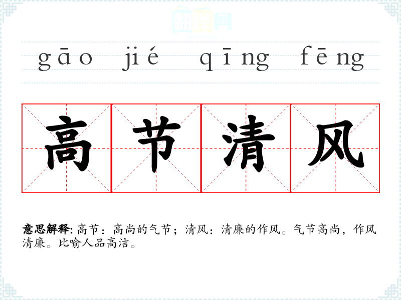 高节:高尚的气节;清风:清廉的作风。气节高尚,作风清廉。比喻人品高洁。
