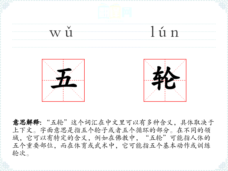 “五轮”这个词汇在中文里可以有多种含义,具体取决于上下文。字面意思是指五个或者五个循环的部分。在不同的领域,它可以有特定的含义,例如在中,“五轮”可能指人体的五个重要部位,而在体育或武术中,它可能指五个基本动作或训练轮次。