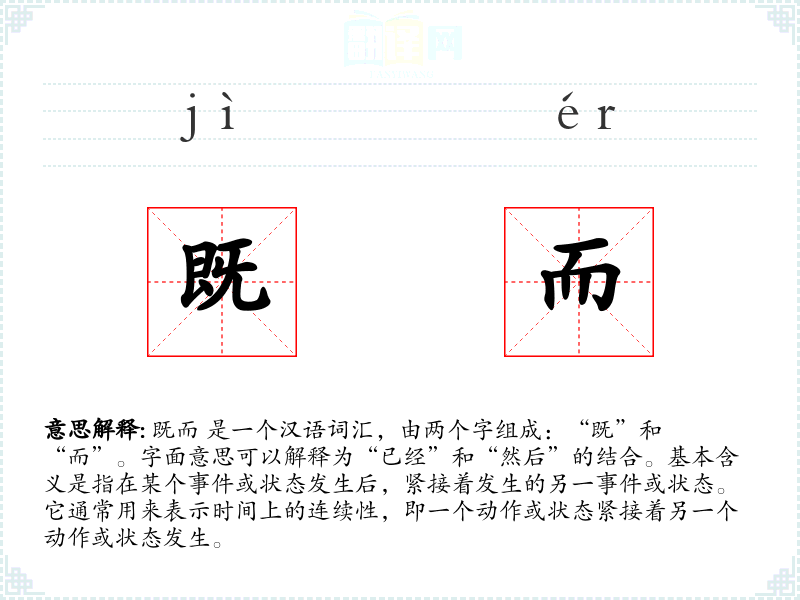 既而 是一个汉语词汇,由两个字组成:“既”和“而”。字面意思可以解释为“已经”和“然后”的结合。基本含义是指在某个事件或状态发生后,紧接着发生的另一事件或状态。它通常用来表示时间上的连续性,即一个动作或状态紧接着另一个动作或状态发生。