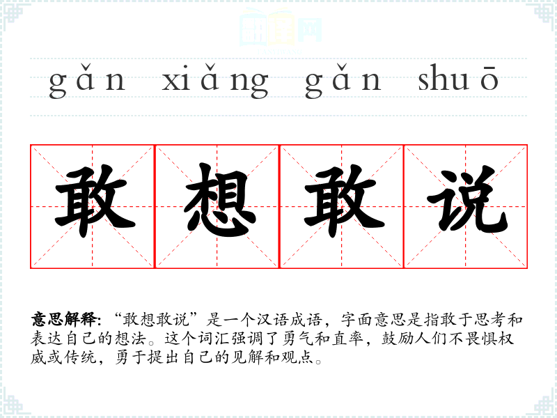“敢想敢说”是一个汉语成语,字面意思是指敢于思考和表达自己的想法。这个词汇强调了勇气和直率,鼓励人们不畏惧权威或传统,勇于提出自己的见解和观点。