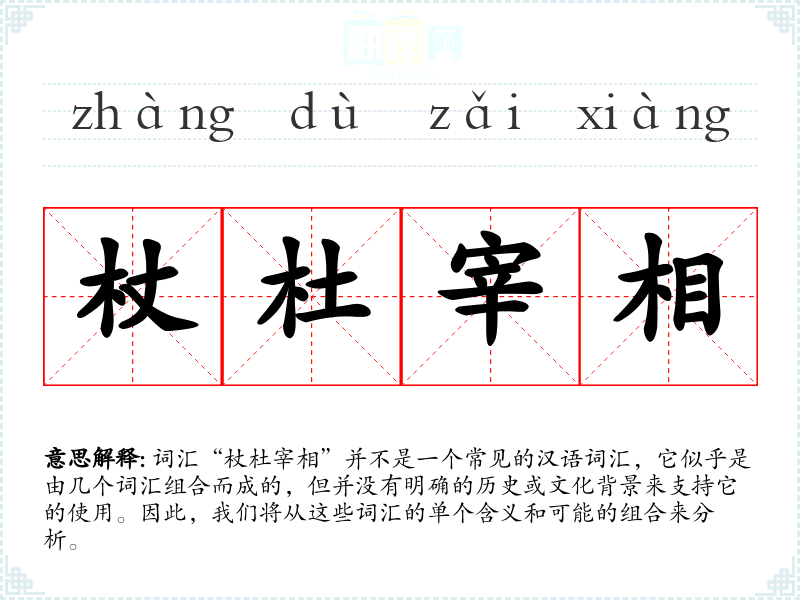 词汇“杖杜宰相”并不是一个常见的汉语词汇,它似乎是由几个词汇组合而成的,但并没有明确的历史或文化背景来支持它的使用。因此,我们将从这些词汇的单个含义和可能的组合来分析。