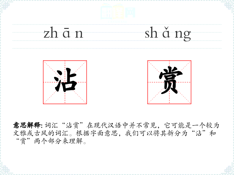 词汇“沾赏”在现代汉语中并不常见,它可能是一个较为文雅或古风的词汇。根据字面意思,我们可以将其拆分为“沾”和“赏”两个部分来理解。