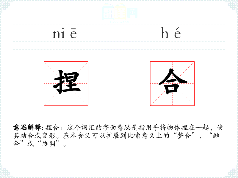 捏合:这个词汇的字面意思是指用手将物体捏在一起,使其结合或变形。基本含义可以扩展到比喻意义上的“整合”、“融合”或“协调”。