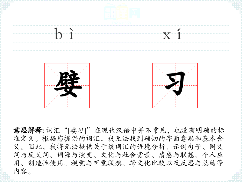 词汇“[嬖习]”在现代汉语中并不常见,也没有明确的标准定义。根据您提供的词汇,我无法找到确切的字面意思和基本含义。因此,我将无法提供关于该词汇的语境分析、示例句子、同义词与反义词、词源与演变、文化与社会背景、情感与联想、个人应用、创造性使用、视觉与听觉联想、跨文化比较以及反思与总结等内容。