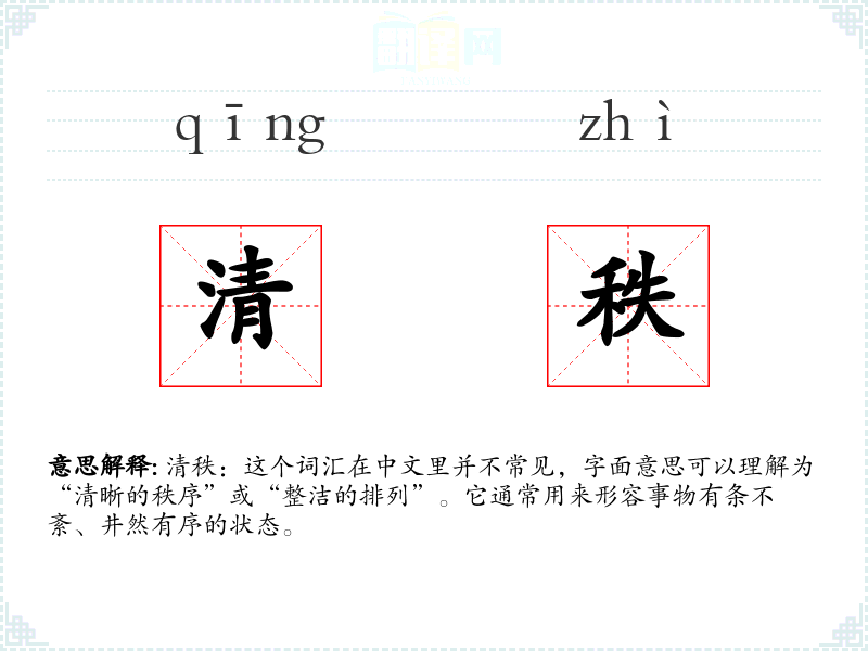 清秩:这个词汇在中文里并不常见,字面意思可以理解为“清晰的秩序”或“整洁的排列”。它通常用来形容事物有条不紊、井然有序的状态。