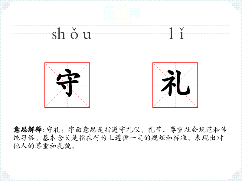 - 文学:在文学作品中,守礼常常用来描述人物的行为举止,如“他总是守礼有加,深受长辈喜爱。”