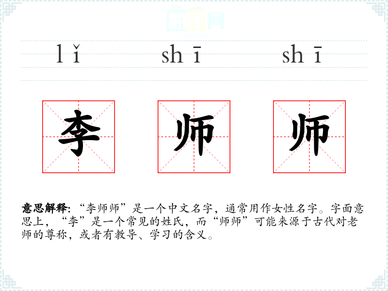 “李师师”是一个中文名字,通常用作女性名字。字面意思上,“李”是一个常见的姓氏,而“师师”可能来源于古代对老师的尊称,或者有教导、学*的含义。