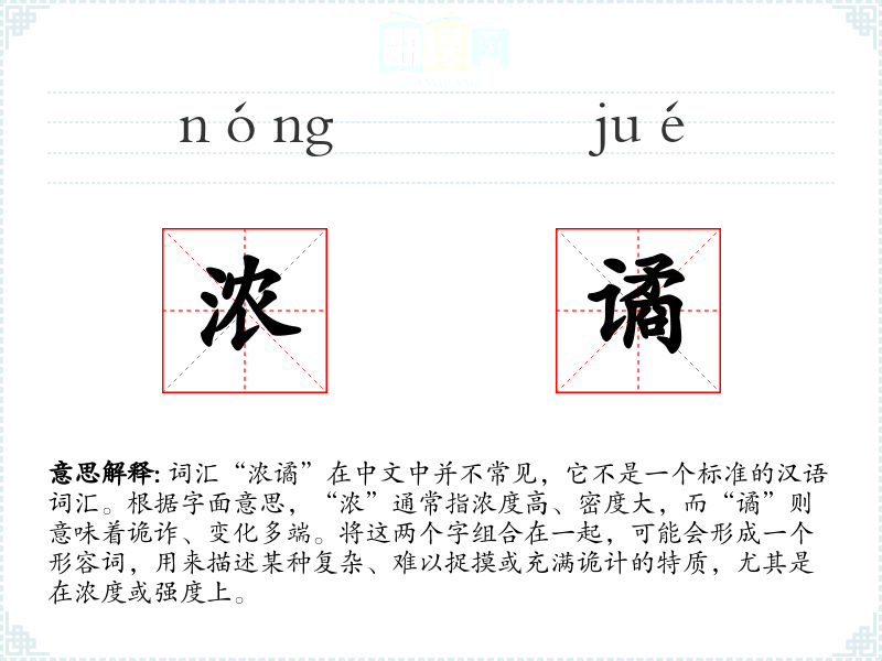 由于“浓谲”不是一个标准词汇,它的词源和演变难以追溯。可能是由两个常用字组合而成,用以创造一个新的形容词。
