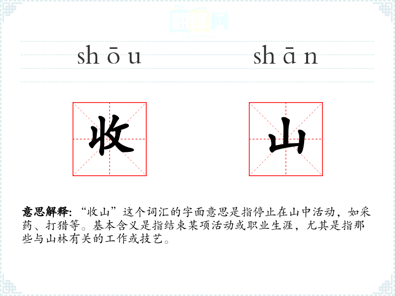 “收山”这个词汇的字面意思是指停止在山中活动,如采药、打猎等。基本含义是指结束某项活动或职业生涯,尤其是指那些与山林有关的工作或技艺。
