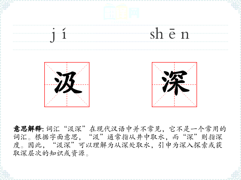 词汇“汲深”在现代汉语中并不常见,它不是一个常用的词汇。根据字面意思,“汲”通常指从井中取水,而“深”则指深度。因此,“汲深”可以理解为从深处取水,引申为深入探索或获取深层次的知识或资源。