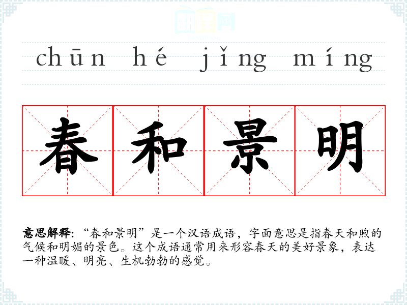 “春和景明”是一个汉语成语,字面意思是指春天和煦的气候和明媚的景色。这个成语通常用来形容春天的美好景象,表达一种温暖、明亮、生机勃勃的感觉。