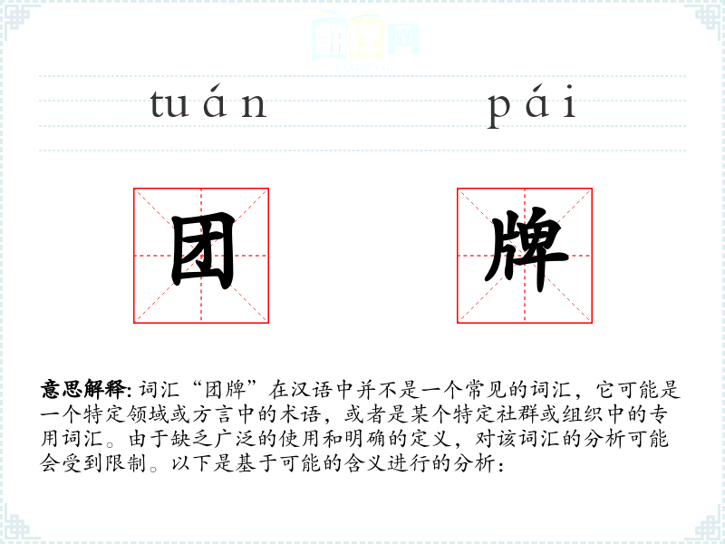 词汇“团牌”在汉语中并不是一个常见的词汇,它可能是一个特定领域或方言中的术语,或者是某个特定社群或组织中的专用词汇。由于缺乏广泛的使用和明确的定义,对该词汇的分析可能会受到限制。以下是基于可能的含义进行的分析: