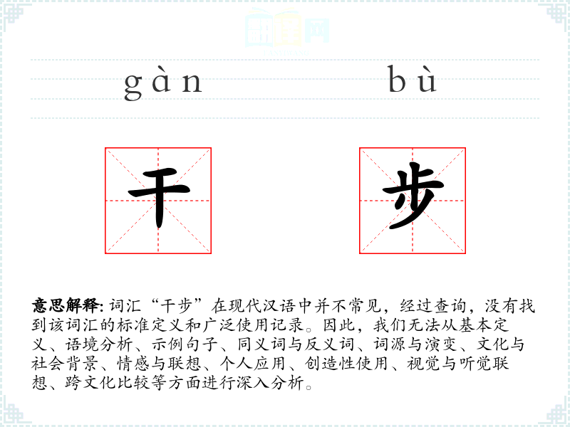 然而,我们可以从这个词汇的字面组合来推测其可能的含义。字面上看,“干”可以有干燥、干练、干涉等含义,而“步”通常指步伐、步骤。结合这两个字,我们可以猜测“干步”可能指的是一种干燥或干练的步伐,或者是在特定情况下采取的干练步骤。