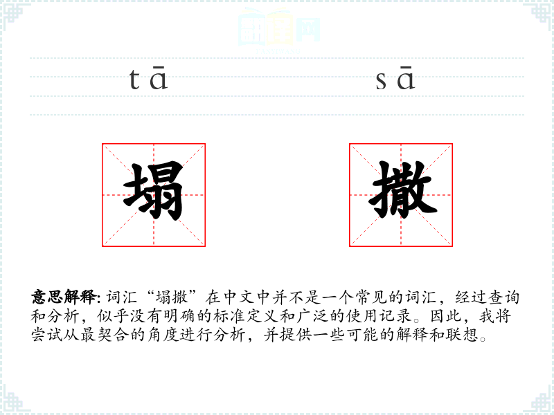 由于“塌撒”不是一个标准词汇,我们无法给出一个确切的字面意思和基本含义。它可能是某个方言中的词汇,或者是某个特定社群中的俚语。
