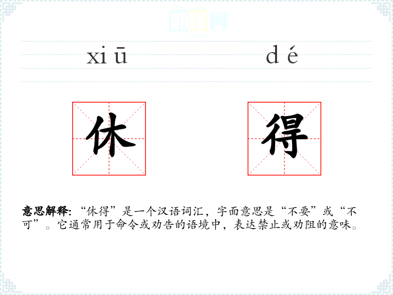 “休得”源自古代汉语,其中“休”有停止、休息的意思,“得”在这里表示可以或能够。随着语言的发展,“休得”逐渐演变成表示禁止或劝阻的词汇。