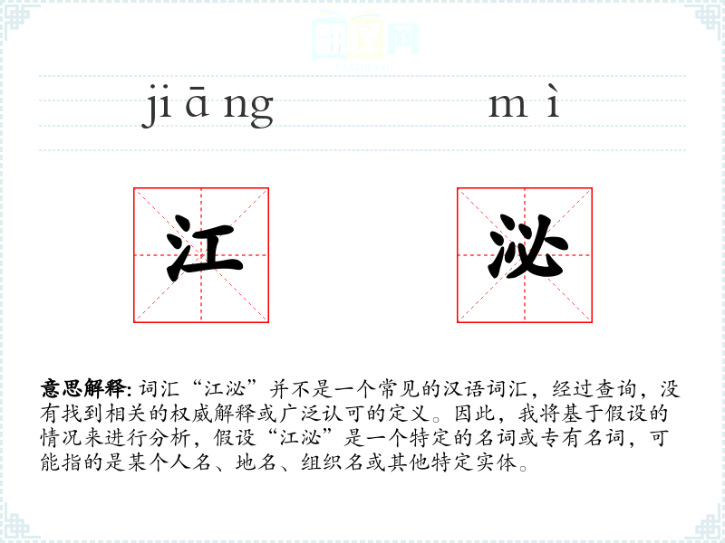 词汇“江泌”并不是一个常见的汉语词汇,经过查询,没有找到相关的权威解释或广泛认可的定义。因此,我将基于假设的情况来进行分析,假设“江泌”是一个特定的名词或专有名词,可能指的是某个人名、地名、组织名或其他特定实体。