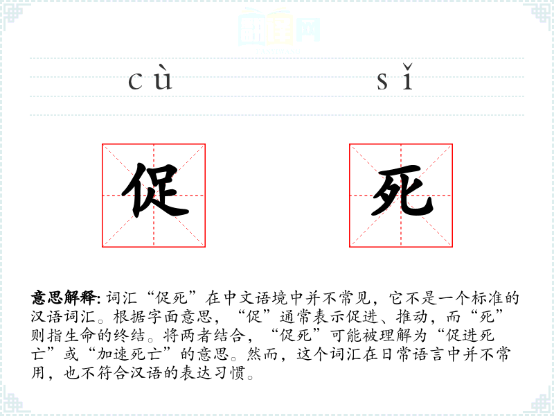 词汇“促死”在中文语境中并不常见,它不是一个标准的汉语词汇。根据字面意思,“促”通常表示促进、推动,而“死”则指生命的终结。将两者结合,“促死”可能被理解为“促进死亡”或“加速死亡”的意思。然而,这个词汇在日常语言中并不常用,也不符合汉语的表达*惯。