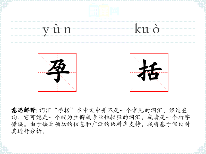 词汇“孕括”在中文中并不是一个常见的词汇,经过查询,它可能是一个较为生僻或专业性较强的词汇,或者是一个打字错误。由于缺乏确切的信息和广泛的语料库支持,我将基于假设对其进行分析。