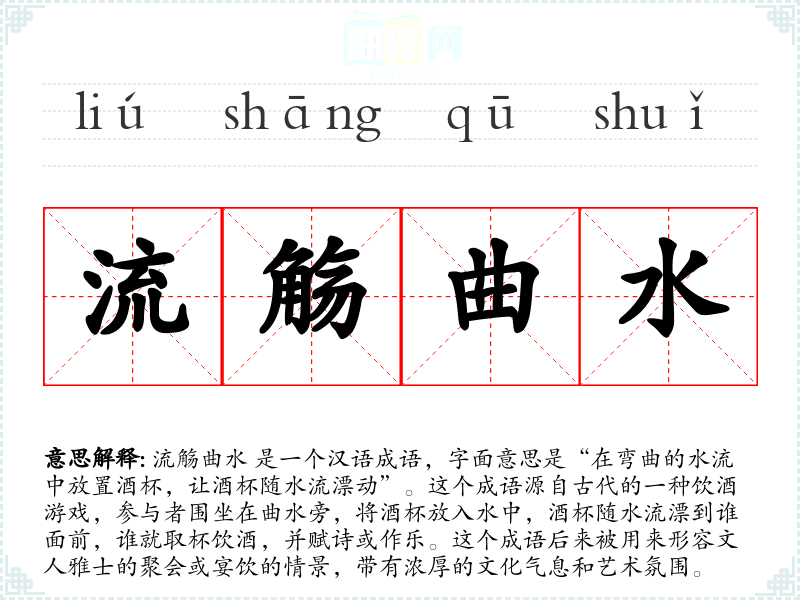 - 曲水流觞:与流觞曲水意思相同,只是词序不同。