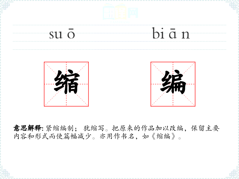 紧缩编制; 犹缩写。把原来的作品加以改编,保留主要内容和形式而使篇幅减少。亦用作书名,如《缩编》。