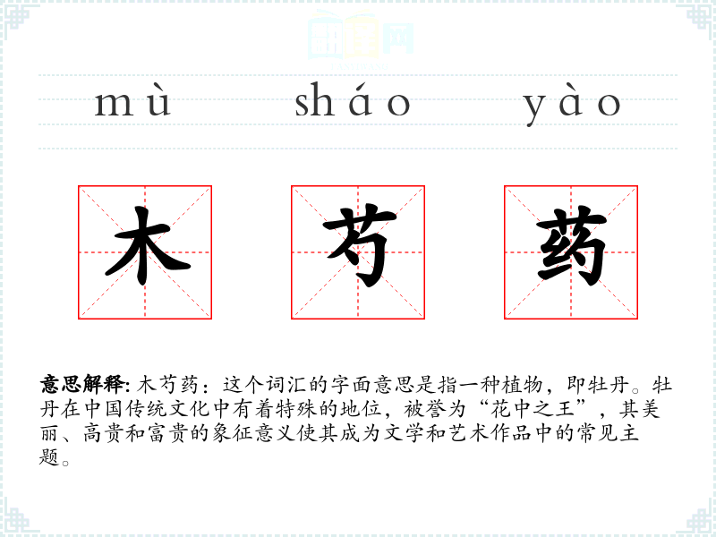 木芍药:这个词汇的字面意思是指一种植物,即牡丹。牡丹在**传统文化中有着特殊的地位,被誉为“花中之王”,其美丽、高贵和富贵的象征意义使其成为文学和艺术作品中的常见主题。