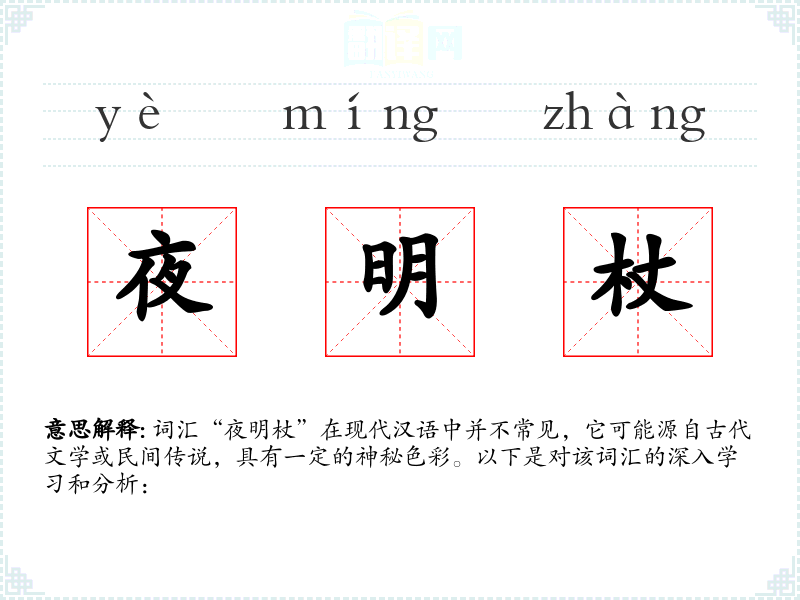 词汇“夜明杖”在现代汉语中并不常见,它可能源自古代文学或民间传说,具有一定的神秘色彩。以下是对该词汇的深入学习和分析: