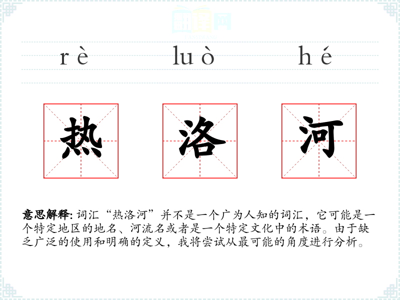 “热洛河”可能指的是一条河流的名称,其中“热”可能与温度或热情有关,“洛”可能是一个地名的一部分,或者是用来表示河流的常用字。