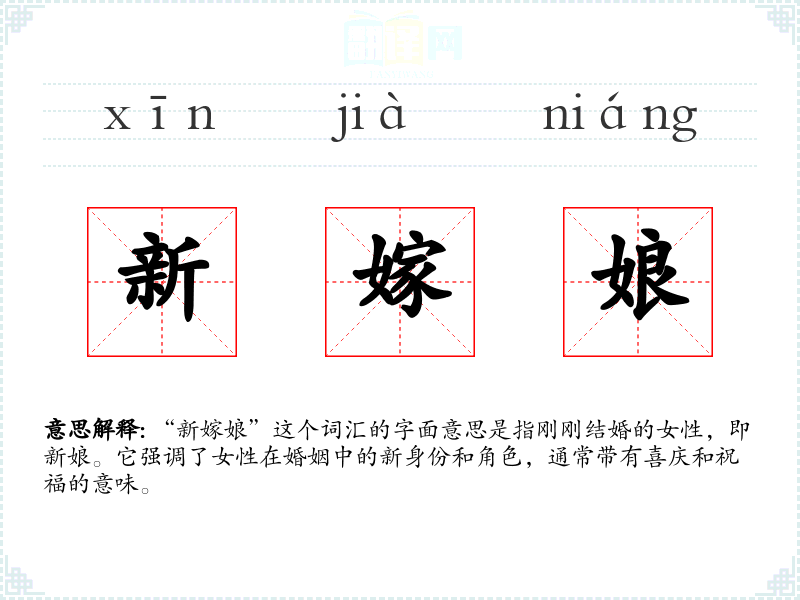 “新嫁娘”这个词汇的字面意思是指刚刚结婚的女性,即新娘。它强调了女性在婚姻中的新身份和角色,通常带有喜庆和祝福的意味。