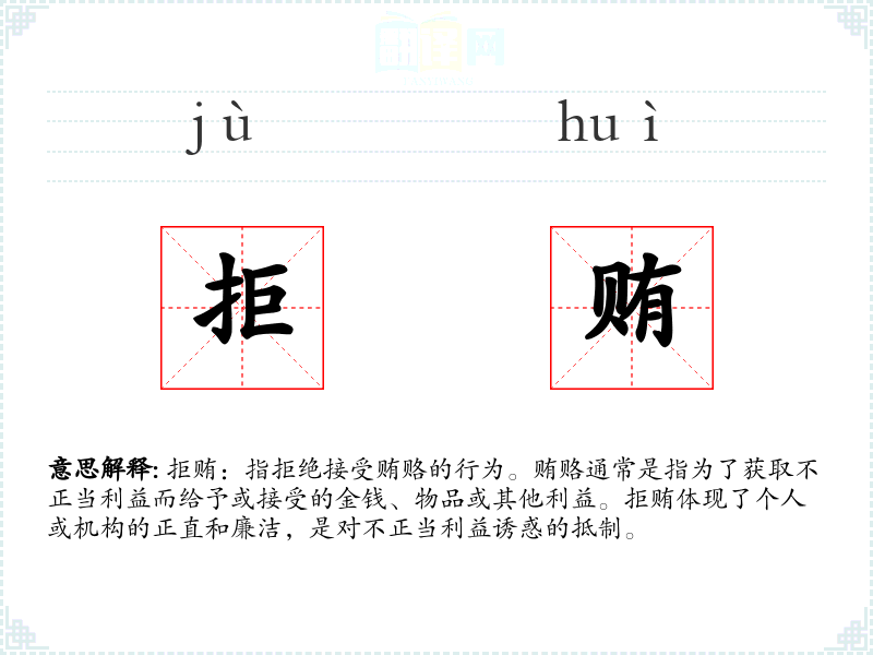 拒贿:指拒绝接受贿赂的行为。贿赂通常是指为了获取不正当利益而给予或接受的金钱、物品或其他利益。拒贿体现了个人或机构的正直和廉洁,是对不正当利益诱惑的抵制。