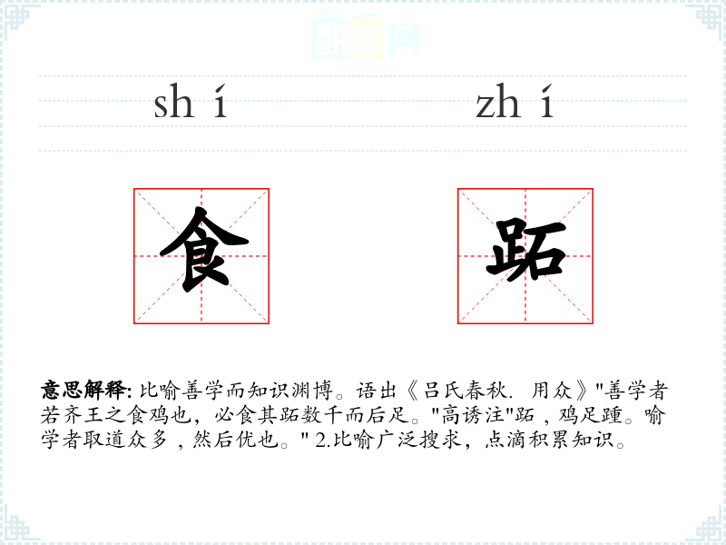 比喻善学而知识渊博。语出《吕氏春秋.用众》"善学者若齐王之食鸡也,必食其跖数千而后足。"高诱注"跖﹐鸡足踵。喻学者取道众多﹐然后优也。" 2.比喻广泛搜求,点滴积累知识。